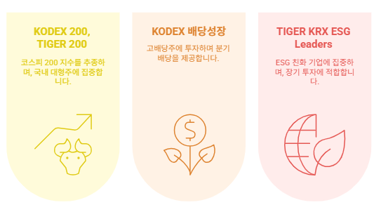 - KODEX 200, TIGER 200: 코스피200 지수 추종, 국내 대형주 중심