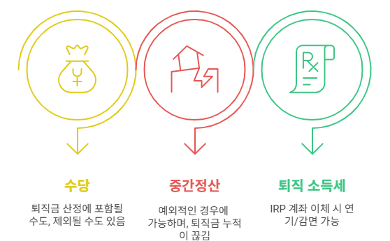 - 퇴직 소득세가 발생하며, 이 금액은 IRP 계좌로 이체 시 일정 금액을 연기하거나 감면받을 수 있습니다.